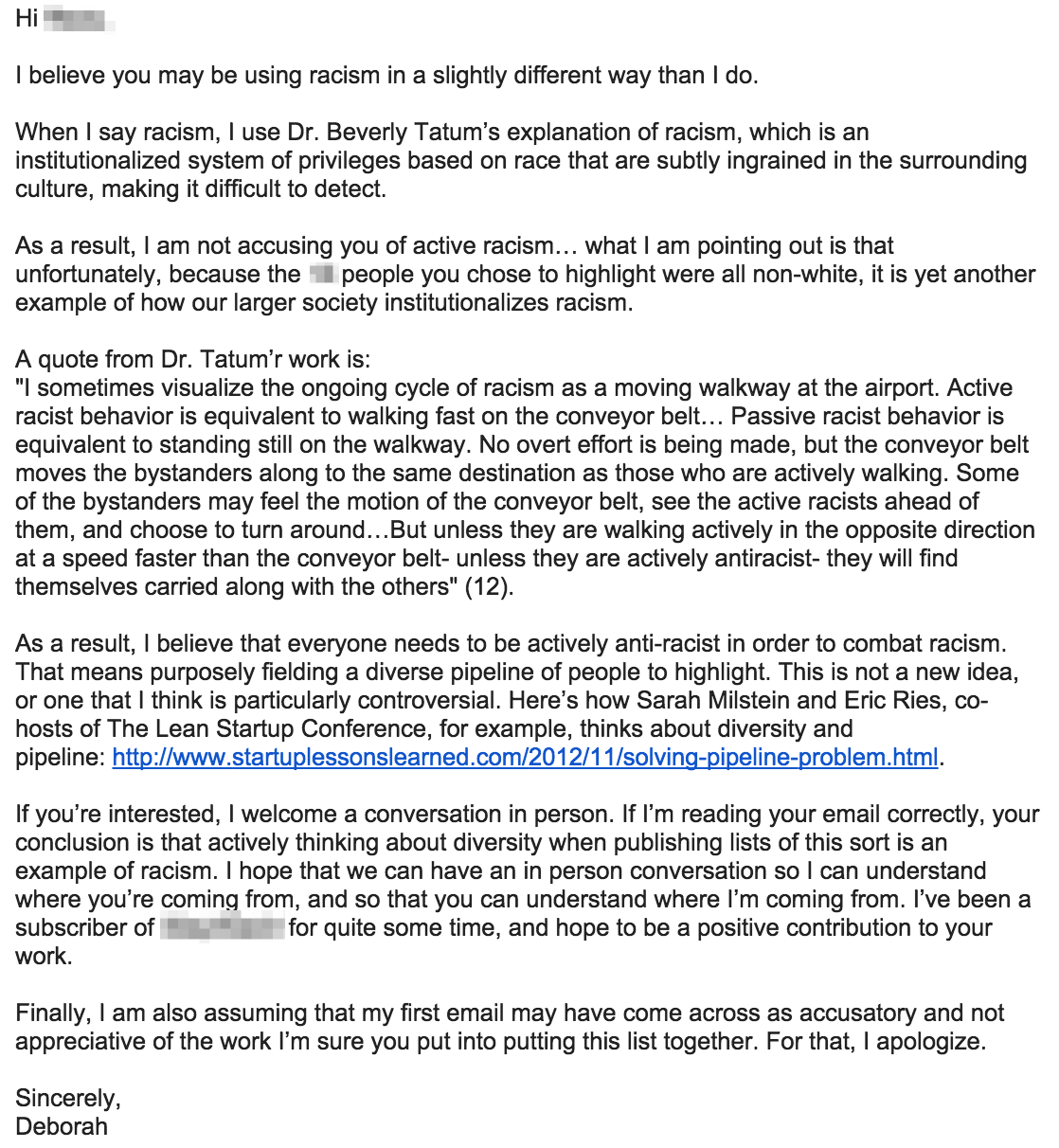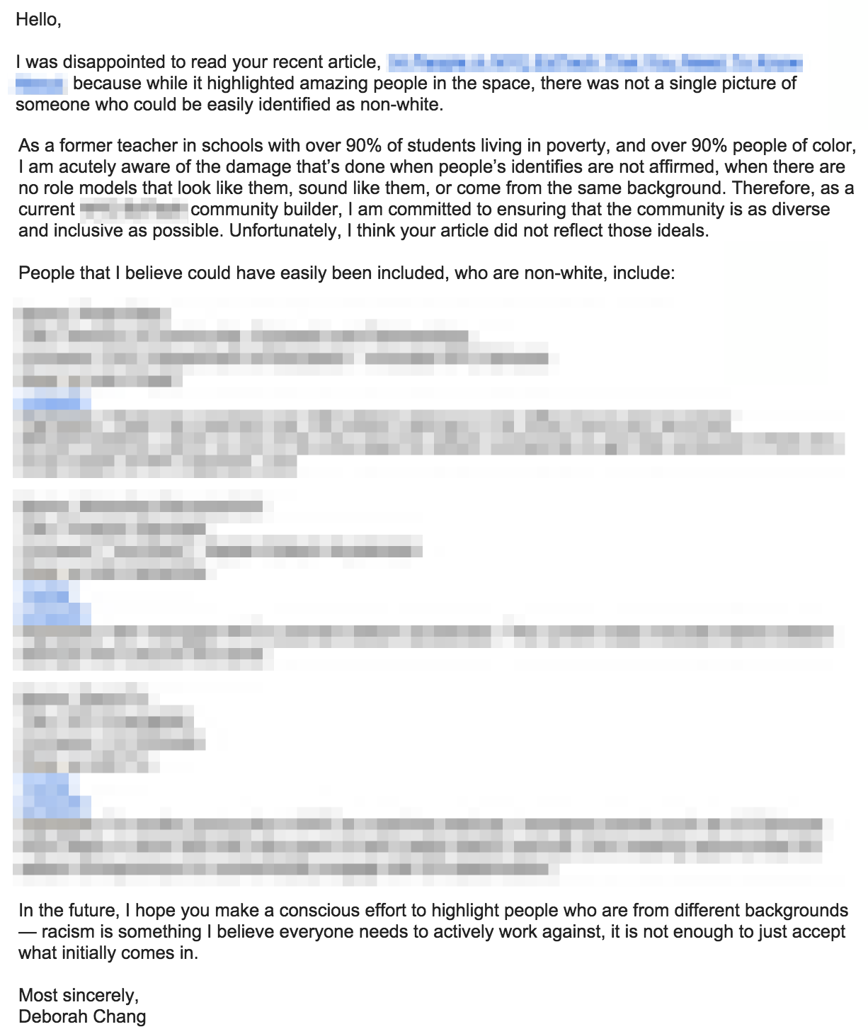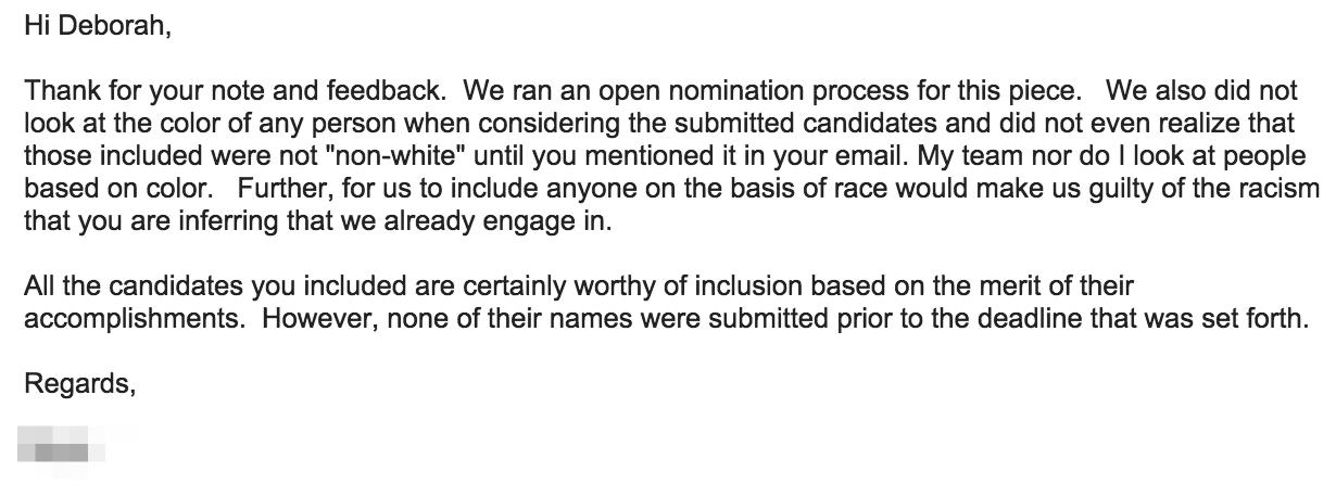I once read an article that attempted to highlight people in the education space. Of the people who were highlighted, 0% appeared to be non-white and only 36% appeared to be women. I chose to email my disappoint to the author of the article and founder of the publication. Unfortunately, he was dismissive of my concerns, mostly because he thought, “My team nor do I look at people based on color. Further, for us to include anyone on the basis of race would make us guilty of the racism that you are inferring that we already engage in.” I replied with a clarification that “when I say racism, I use Dr. Beverly Tatum’s explanation of racism, which is an institutionalized system of privileges based on race that are subtly ingrained in the surrounding culture, making it difficult to read.” I also suggested a conversation in person so that we could understand where we were both coming from and apologized if my first email came off in any way as accusatory or not appreciative of his work.